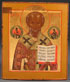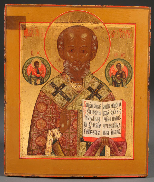 A FINE RUSSIAN ICON OF SAINT NICHOLAS, MSTERA, CIRCA 1880. Finely painted with exquisite gold detailing, Nicholas delivers a blessing and holds an open book of Gospels to a variant of Luke 6:17. The high quality of workmanship is typical of the noted various Moscow workshops operating at the end of the 19th century. 14.1 inches x 12.1 inches (35.8 x 30.7 cm).