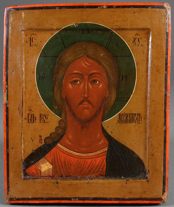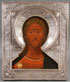 A RUSSIAN ICON OF THE LORD ALMIGHTY, 18TH CENTURY. Painted with dark flesh tones in this less frequently encountered bust portrait style image of Christ and overlaid with a finely crafted silver plated repoussé and chased riza. 12 inches x 10 inches (30.5 x 25.3 cm).