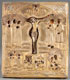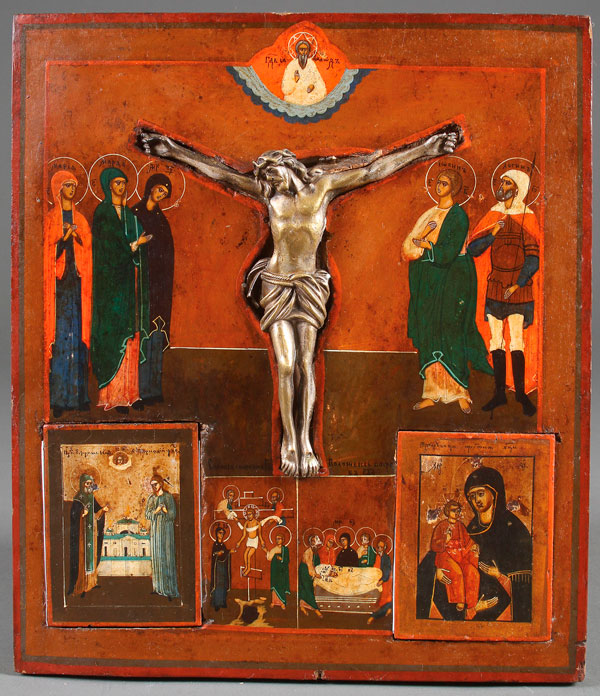 A UNIQUE AND INTERESTING RUSSIAN ICON OF THE CRUCIFIXION WITH RELATED SCENES, 19TH CENTURY. At center, a carved, shaped recess inset with a cast silvered bronze figure of the crucified Christ. At top center, God the Father, on the left the three Marys, on the right, John the Apostle and the Roman Centurion Longinus. Immediately below the crucified Christ, the removal from the cross and the placement in the tomb. In the lower left corner, an inset icon of the venerable Ephraim of Novotorzhersk in front of his monastery and with another saint, and in the lower right corner a inset icon of the three handed Mother of God. Overlaid with a repoussé brass riza. Such icons were often created by incorporating various devotional items gathered on pilgrimages or passed down through the family. 13.75 inches x 12.1 inches (35.2 x 30.5 cm).