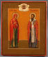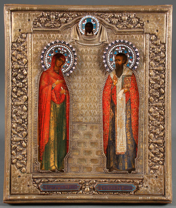 A RUSSIAN ICON OF SAINT ANNA AND SAINT BASIL, 19TH CENTURY. Beneath an image of the Mandylion, two full length images of saints, identified by the inscribed titles above their head as: the Holy Prophetess Anna and Holy Basil the Great. Overlaid with a finely crafted silvered and gilt repoussé and chased riza with applied cloisonné enameled halos and title plaques. 12.5 inches x 10.5 inches (31.7 x 26.7 cm).