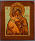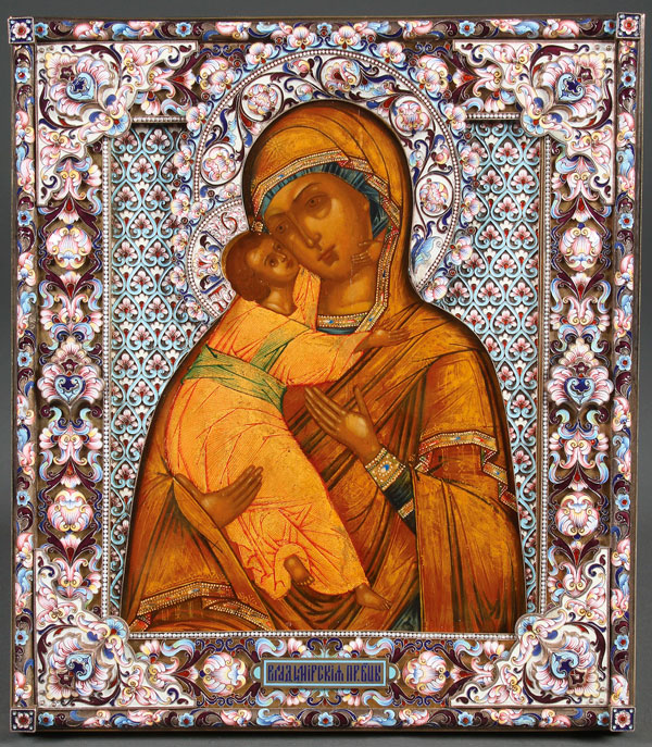 A FINE RUSSIAN ICON OF THE VLADIMIR MOTHER OF GOD. The finely painted icon panel dating from circa 1880 and overlaid with a later, probably last quarter of the 20th century, spectacular silver-gilt and shaded enameled riza with spurious maker's marks and hallmarks. 12.25 inches x 10.75 inches (31 x 27.1 cm).