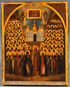 A RUSSIAN ICON OF THE MIRACLE WORKING SAINTS OF THE PECHERSK LAVRA, KIEV, 19TH CENTURY. At top center, two angels holding an icon of the Dormition above the Dormition Cathedral, and below, on the left and right, the Kievian Miracle Workers and below an inscription, a prayer to the most holy fathers, the "fountains of miracles" to pour out their wonders on the world, and pray unceasingly to the Lord for benefit of the world. 10.5 inches x 8.3 inches (26.7 x 21.4 cm).