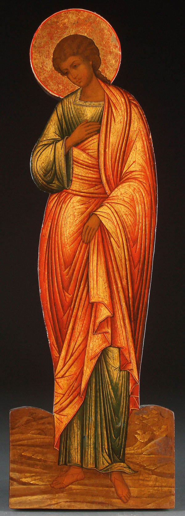 A RUSSIAN ICON OF THE APOSTLE SAINT JOHN, CIRCA 1890. Once forming part of a free standing crucifixion grouping, finely executed and with extensive use of chrysography. 24.75 inches x 8 inches (63 x 20.5 cm).