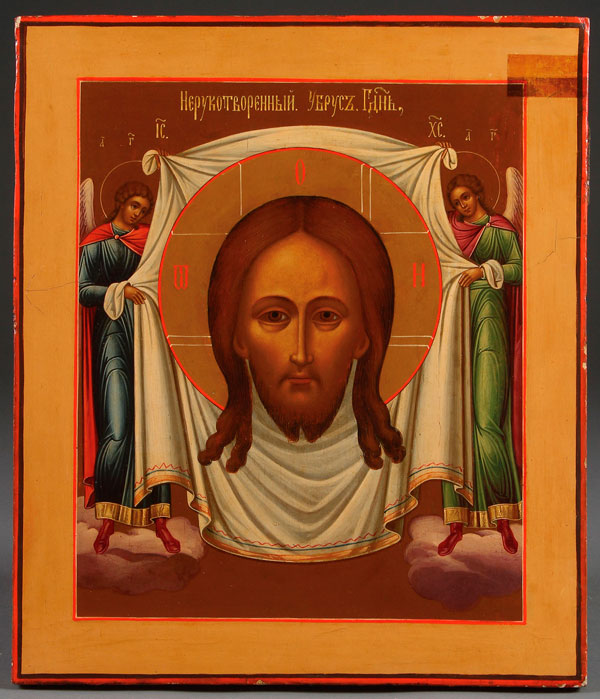 A RUSSIAN ICON OF THE HOLY VISAGE, CIRCA 1875. Finely painted, two angels hold the cloth on which the face of Christ was miraculously transferred. Verso with original label printed in Russian of "Icon painter and life painter M.I. Yudin taking orders for icon painting, portrait images, banners and shrouds with stamping and gilding, gilded frames and kiots of various kinds, located at the fountain near the Semenov bridge, St. Petersburg". 14 inches x 12 inches (35.6 x 30.7 cm).