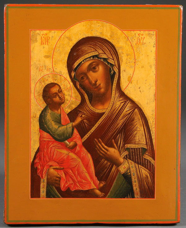 A RUSSIAN ICON OF THE MOTHER OF GOD, CIRCA 1800. A finely painted icon combining both the Byzantine and Western (Italianate) styles. 14.1 inches x 11.3 inches (36.1 x 29 cm).