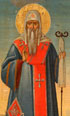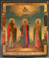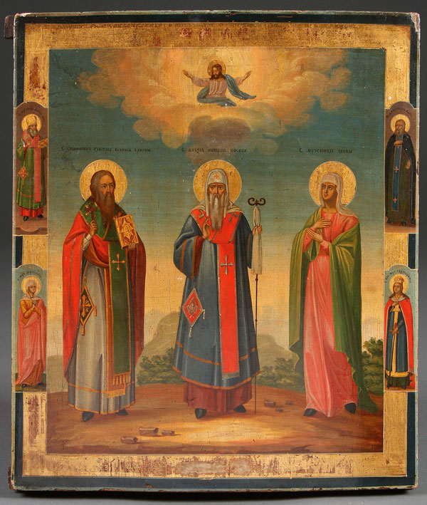 A RUSSIAN ICON OF SELECTED SAINTS, CIRCA 1800. At top center, Christ delivers a blessing from the heavens and below, three full length images of the Holy Hieromartyr Gregory of Greater Armenia, the Holy Alexei Metropolitan of Moscow, and the Holy Martyr Irene. The borders with the Holy Michael Metropolitan of Kiev, the Holy Martyr Tatiana, the Venerable Demitrius of Priluki, and the Holy Great Martyr Ekaterina. 14 inches x 12.1 inches (35.6 x 30.8 cm).
