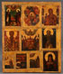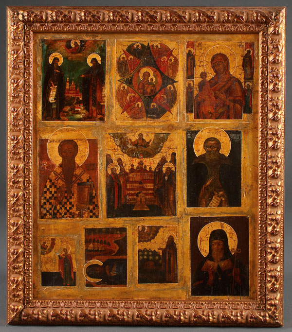 A LARGE INTERESTING MULTIPLE SUBJECT COMPOSITE RUSSIAN ICON, 18TH/19TH CENTURY. The large panel inset with ten icons from various time periods. From left to right, top to bottom, they include: a pair of Monastic saints in front of their monastery, the Unburnt Thornbush Mother of God, the Three Handed Mother of God, Saint Kharlampiy, Miracle Working Saints of Rostov, St. Alexander Svirskiy, St. Daria, St. Thomas, St. Theodor of Totmost, St. Kornilia and St. Mitrophan of Voronezh. 21 inches x 17.75 inches (53.3 x 45.1 cm). Contained in a later gilt frame.
