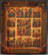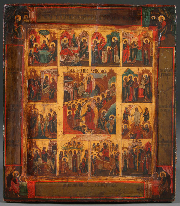 A RUSSIAN ICON OF THE RESURRECTION WITH FEASTS, 19TH CENTURY. Each corner displaying one of the Evangelists. 13.8 inches x 12.25 inches (35.4 x 31.2 cm).