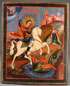 A RUSSIAN ICON OF SAINT GEORGE, 19TH CENTURY. A large and colorful icon depicting Saint George atop a white steed thrusting his lance into the dragon beneath him. 21 inches x 17 inches (53.3 x 43.2 cm).