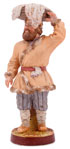 A RUSSIAN HAND PAINTED BISQUE PORCELAIN FIGURE, GARDNER, 19TH CENTURY. Modeled as a male peasant peddler balancing his wares atop his head as he walks through the market. Underside with Gardner red factory mark beneath the Imperial Warrant. Height 8.8 inches (22 cm).