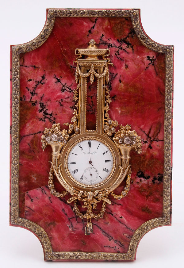 A FRENCH RHODONITE AND SILVER GILT MOUNTED DRESSER CLOCK, CIRCA 1900. Of rectangular form, containing a jeweled watch movement with porcelain dial inscribed "Moser & Co.", surrounded by silver-gilt mounts of scrolling floral baskets on a rhodonite ground within a raised acorn and oak leaf bordered rim. The verso with easel support on a burl wood back, stamped with indistinguishable hallmarks. Height 8.5 inches (22 cm).