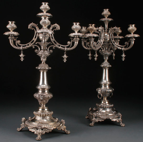 A VERY FINE PAIR OF GERMAN RENAISSANCE REVIVAL SILVER CANDELABRA, LATE 19TH CENTURY. With four scrolling arms with griffins head terminals raised on a candlestick base with lions head masks and winged caryatid footed plinth. With German Hanau marks including 800, crown and moon, and "Rosen". Height 22.25 inches (56.5 cm). Weight 99.7 troy ounces.