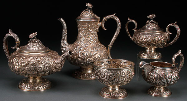A VERY FINE STIEFF STERLING REPOUSSÉ FIVE PIECE TEA SET, EARLY 20TH CENTURY. With an all over repoussé pattern of wild flowers on a stippled ground, comprising a coffee pot, tea pot, covered sugar, creamer, and waste bowl. Marks on base include Stieff logo, sterling, 900, and JW monogram. Largest height 10.25 inches (26 cm). Total weight 86.5 troy ounces.