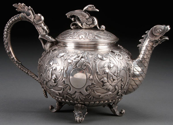 A G.ACCARISI ITALIAN RENAISSANCE REVIVAL SILVER TEAPOT, 19TH CENTURY. Of compressed bulbous form with a figural dragon handle and spout, the lid surmounted with a winged goose below a well repoussed and chased body decorated with foliate scrolls serpents and cartouches. The base stamped “G. ACCARISI”. Weight 22.2 troy ounces, length 8.5 inches (22 cm).
