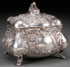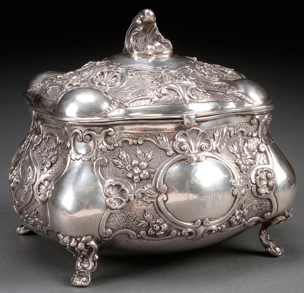 A GERMAN SILVER LIDDED DRESSER BOX, LATE 19TH CENTURY. Of Rococo style with repoussed florals, strapwork and scalloped cartouches on a stippled ground. The base stamped with a crescent, crown, 800 and “A.M.D.” Weight 11.62 troy oz. Length 5.25 inches (13.5 cm).