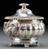 A CONTINENTAL SILVER LIDDED SUGAR BOWL, 19TH/20TH CENTURY. Hand hammered melon ribbed form with cashed florals flanked by loop handles with bearded facial mask terminals, stamped hallmarks on base. Length 6.25 inches (16 cm), weight 18.42 troy ounces.