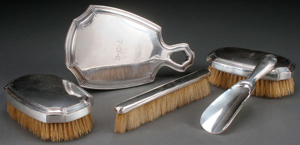 A TIFFANY & CO. FOUR PIECE STERLING DRESSER SET, EARLY 20TH CENTURY. Comprising two clothes brushes, a hand mirror and a shoe horn, each with stamped hallmarks and pattern numbers. Together with a sterling bonnet brush. All with "DME" monograms. The largest 8.125 inches (20.5 cm).