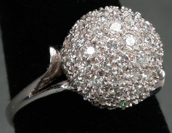 A LADIES DIAMOND PAVÉ AND PLATINUM SNOWBALL COCKTAIL RING, CIRCA 1975. Set with approx. 1 ct. total weight full cut diamonds in a spherical form pavé setting. Stamped "10% irid. Plat". Weight 9 grams.