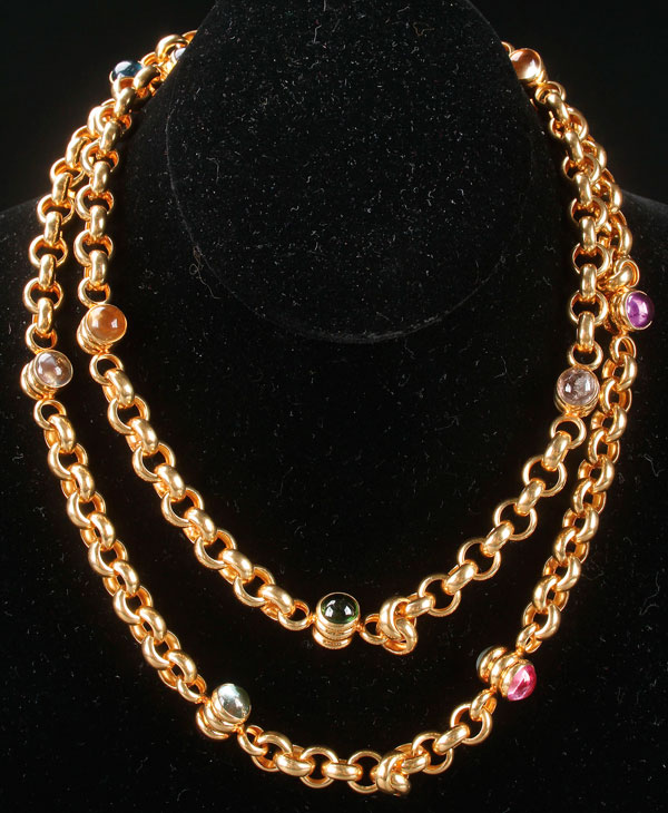AN 18K YELLOW GOLD AND SEMI PRECIOUS GEMSTONE FASION NECKLACE, LAST QUARTER 20TH CENTURY, VERONA, ITALY. Containing 11 gold barrel form links with each end set with a cabochon semi-precious gemstone, stamped "18k, star 20, and VR". Total length 36 inches, weight 2.9 troy ounces.