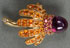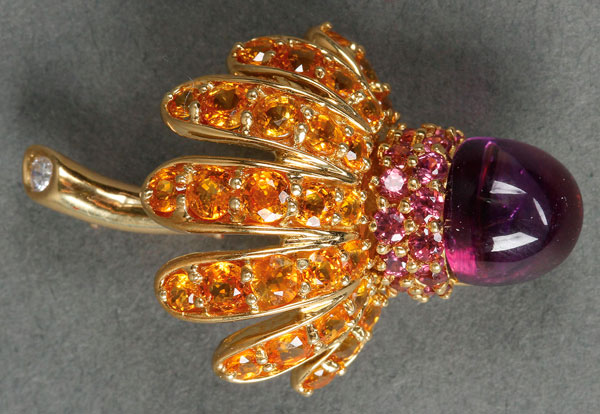 A TIFFANY AND CO AMERICAN FLOWERS "BLACK EYED SUSAN" 18K GOLD AND GEMSTONE BROOCH, CIRCA 1993. Of floral form with a 4.40 ct. cabochon cut amethyst, 29 round yellow sapphires with a 4.60 ct. total weight, 13 round rhodolite garnets weighing 1.00 ct. and a round full cut diamond weighing .08 ct., G-H color, VVS-VS clarity. Total weight 15 grams.