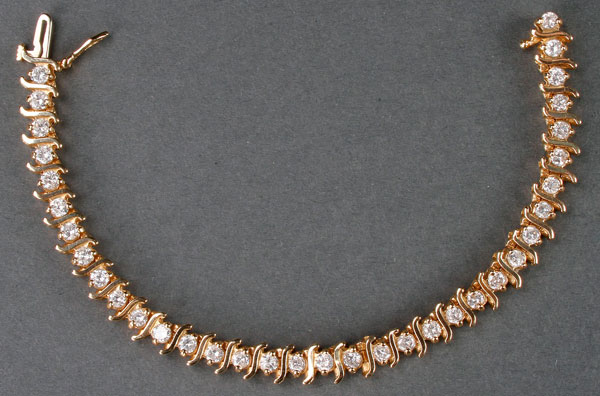 A LADIES 14K GOLD AND DIAMOND TENNIS BRACELET, CIRCA 1990. Containing 35 brilliant cut diamonds set within "S" shaped links weighing approx. 5 ct. total, length 7 inches, total weight 22 grams.