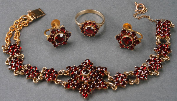A GOOD SCANDINAVIAN SILVER GILT GARNET BRACELET AND EARRING SET, EARLY 20TH CENTURY. Comprising a bracelet, two earrings and a finger ring, the clasp stamped .830 and with makers mark HGR.