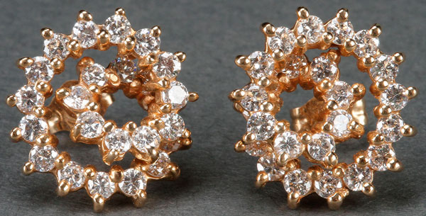 A PAIR OF 14K GOLD AND DIAMOND EARRINGS, LATE 20TH CENTURY. Of spiral form containing 48 full cut diamonds weighing approx. 1.62 ct. tw, total weight 5 grams, diameter .625 inches (1.5 cm).