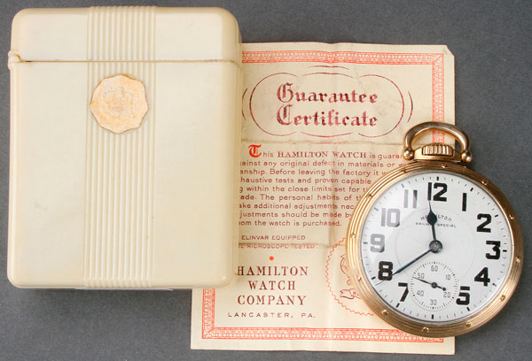 A HAMILTON RAILWAY SPECIAL POCKETWATCH, CIRCA 1949. With a 992B 21 jewel movement contained in a 10k gold filled case, serial # C259184, with original plastic case and papers. Diameter 2 inches (5 cm).
