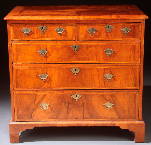 A GOOD ENGLISH CHIPPENDALE WALNUT CHEST, CIRCA 1790. With two top drawers over three drawers, raised on bracket feet. Height 36.75 inches (93.3 cm), width 38.5 inches (98 cm), depth 22.75 inches (58 cm).