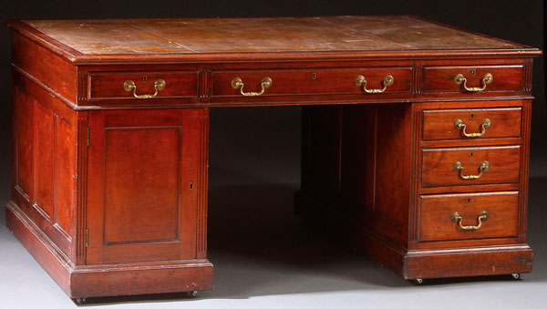 A GEORGIAN STYLE MAHOGANY PARTNERS DESK. Of two pedestal form, with leather top. Height 30.75 inches (78 cm), width 60 inches (153 cm), depth 42 inches (107 cm).