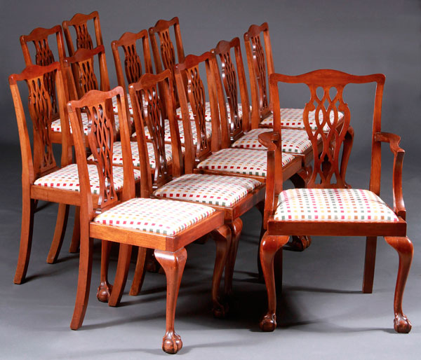 12 CHIPPENDALE STYLE CHAIRS, 20TH CENTURY. 11 Chippendale style mahogany side chairs and one arm chair, each with scroll cut backs and raised on carved claw and ball feet. Chair height 38.5 inches (98 cm).
