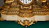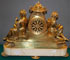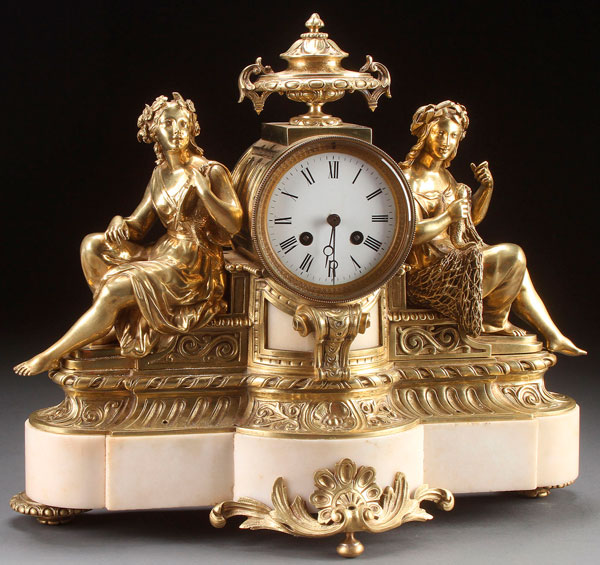 A FRENCH NEO-CLASSIC STYLE GILT BRONZE AND MARBLE FIGURAL MANTLE CLOCK, LATE 19TH CENTURY. With figures of a woman with fowl and woman with netted fish flanking a circular clock raised on a bracketed plinth with conforming marble base. Length 17.25 inches (44 cm), height 15.25 inches (38.5 cm).