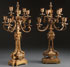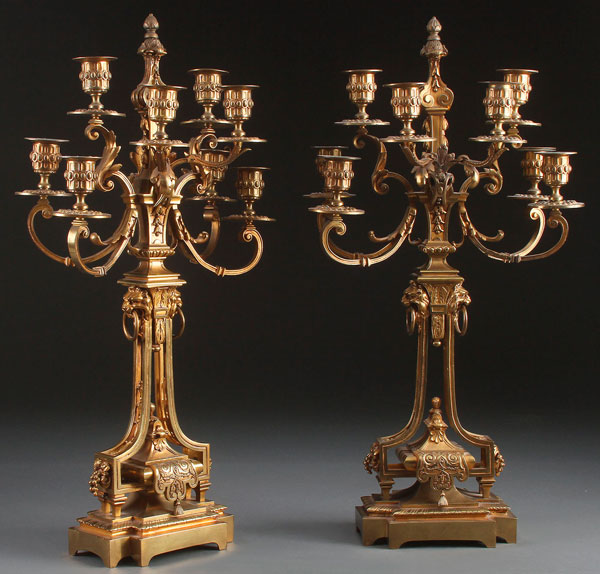 A PAIR OF FRENCH ASTHETIC GILT BRONZE CANDELABRA, LATE 19TH CENTURY. Each with eight scrolled acanthus candle arms, raised on framework base with floral decoration and lion mask handles. Height 23.5 inches (59.5 cm).