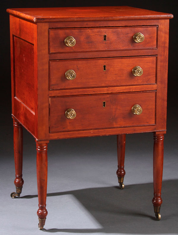 A VERY FINE AMERICAN SHERATON CHERRY WOOD WORK STAND, PHILADELPHIA, CIRCA 1810-20. Three cock beaded drawers with brass pulls raised on finely turned legs terminating in offset castors. Original finish. Height 26.75 inches (68.3 cm), width 17.75 inches (45 cm), depth 15.75 inches (40 cm).