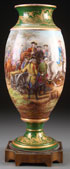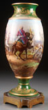 A SEVRES STYLE HAND PAINTED URN, LATE 19TH CENTURY. With Napoleonic battle scenes by "H. Desprez", raised on a bronze plinth. Height 21.25 inches (54 cm).