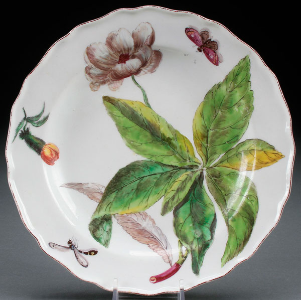 A CHELSEA PORCELAIN BOTANICAL PLATE, CIRCA 1755. Of circular form with scalloped rim, the cavetto and borders with hand painted flowers, leaves, butterfly, dragonfly and flowering bud and brown-line rim. Underside with red-anchor mark. Diameter 8.1 inches (20.5 cm).