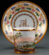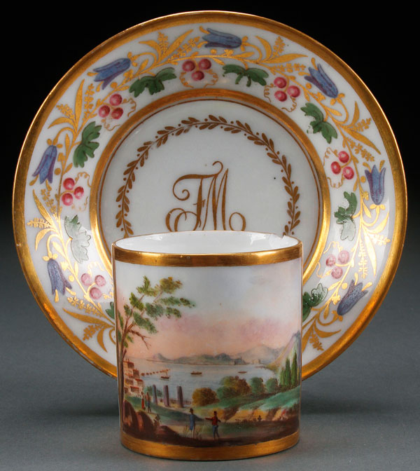 A HAND PAINTED NEAPOLITAN SCENIC CUP AND SAUCER, 19TH CENTURY. The saucer decorated with gold banding, vines and berries and with FM monogram and the cup painted with a scene of the bay of Naples. Each with a blue glaze crown N mark. The interior of cup with chip on rim. Saucer diameter 5 inches (12.5 cm).