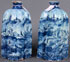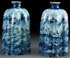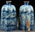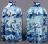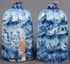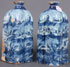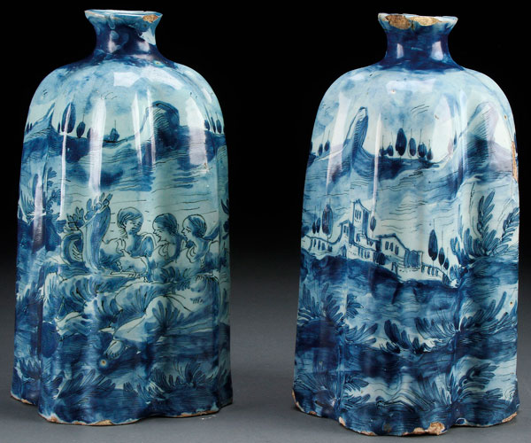 A PAIR OF SAVONA (ITALIAN) BLUE AND WHITE MAIOLICA GLAZED TERRACOTTA BOTTLES, 16TH/17TH CENTURY. Of elongated melon ribbed form. Depicting seaside scenes with figures. The bases with hand painted crowned bird marks. Some glaze loss. Height 9.75 inches (25 cm).