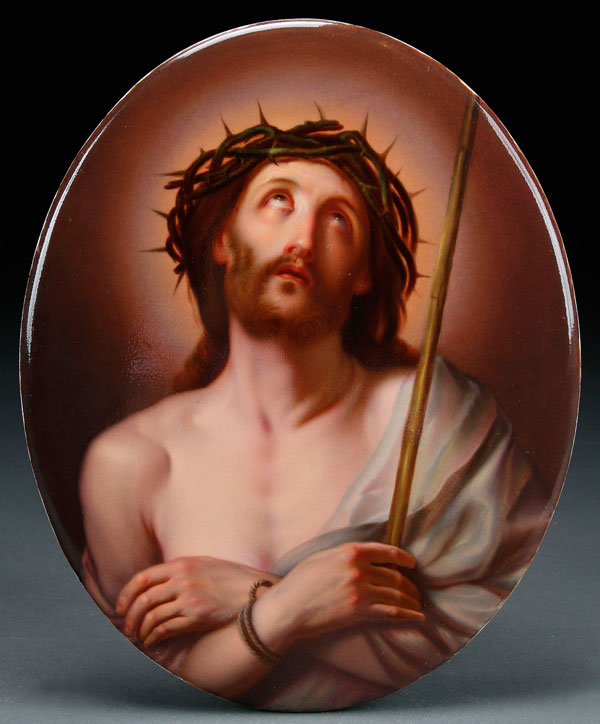 A LARGE KPM (AFTER RENI) HAND PAINTED PORCELAIN PLAQUE, LATE 19TH CENTURY. "Ecce Homo", of oval form finely painted, the verso with impressed KPM and scepter mark. 10.75 inches x 8.75 inches (27.3 x 22.3 cm).