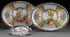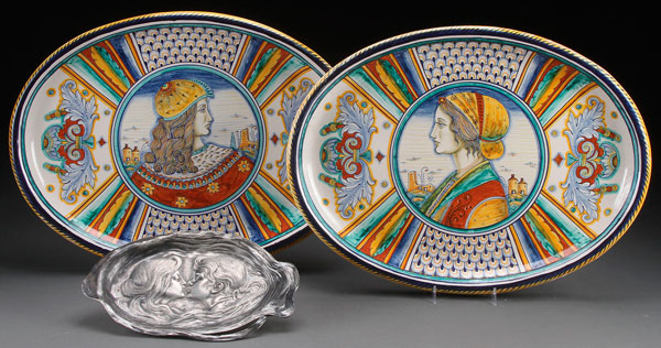 A PAIR OF ITALIAN MAJOLICA DERUTA OVAL POTTERY TRAYS, 20TH CENTURY. In the Italian renaissance style, with portraits of a man and woman. The verso inscribed Deruta, Dipinto, A.Mano. Length 19.5 inches (39.5 cm). Together with a Austrian art nouveau pewter tray with an embossed scene of sapphic lovers, length 11 inches (28 cm).