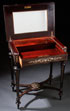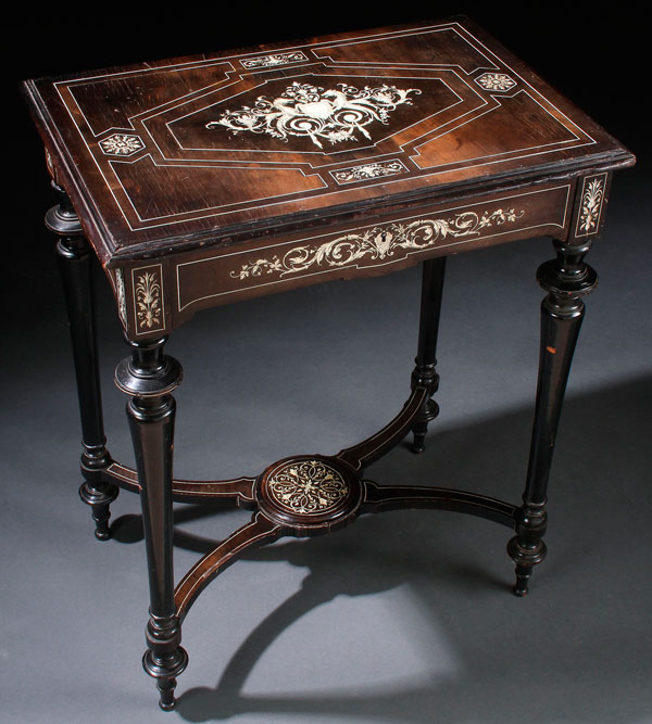 ITALIAN (MILANESE) IVORY INLAY AND EBONIZED DRESSING TABLE, 19TH CENTURY. Finely inlaid with an etched ivory design of two winged griffins supporting a shield, within scrolled foliate designs. The skirt and drawer with similar scrolled foliate animal forms and facial masks. Raised on four turned legs. The hinged lid opening to reveal a beveled mirror and rosewood interior. Height 28.5 inches (71.6 cm), width 23 inches (59 cm), depth 15.5 inches (39.3 cm).