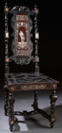 ITALIAN (MILANESE) IVORY INLAY AND EBONIZED SIDE CHAIR, 19TH CENTURY. The back inlaid and etched with a Renaissance style figure within a portico reserve surmounted with scrolled foliates, winged griffins and facial masks, flanked by turned uprights with inlaid ivory rosettes and ivory plaques decorated with figural cupids. Height 46 inches (116.8 cm), width 18.75 inches (47.6 cm), depth 17.25 inches (43.3 cm).