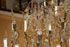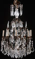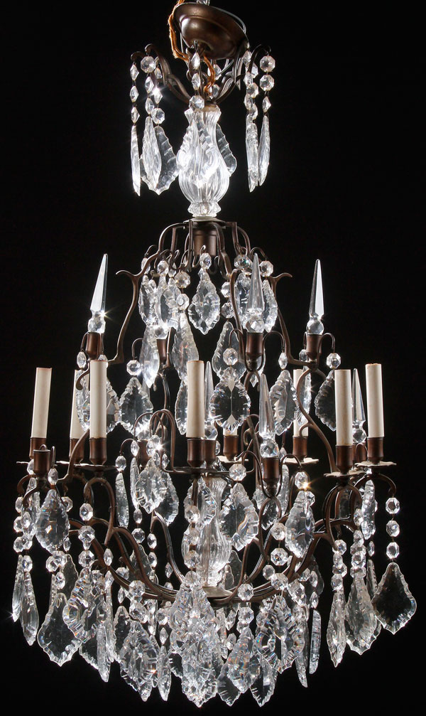 A VERY FINE LOUIS XVI STYLE CUT GLASS CHANDELIER, EARLY 20TH CENTURY. With scrolled bronze frame supporting eight candle sockets and cut crystal prisms on three tiers. Possibly Baccarat. Hanging length 40 inches (101.5 cm), width 22 inches (56 cm).