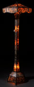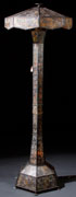 A LARGE AND IMPRESSIVE SILVERED METAL OVERLAY SLAG GLASS FLOOR LAMP, EARLY 20TH CENTURY. Probably by Revere Studios in a style similar to the Tiffany pine needle pattern. The octagonal paneled shade surmounting an elongated paneled stand with matching metal overlay and slag glass panels, the base and stem internally lit the entire length. Apparently unmarked. Height 71.25 inches (181 cm), diameter of shade 26 inches (66 cm).