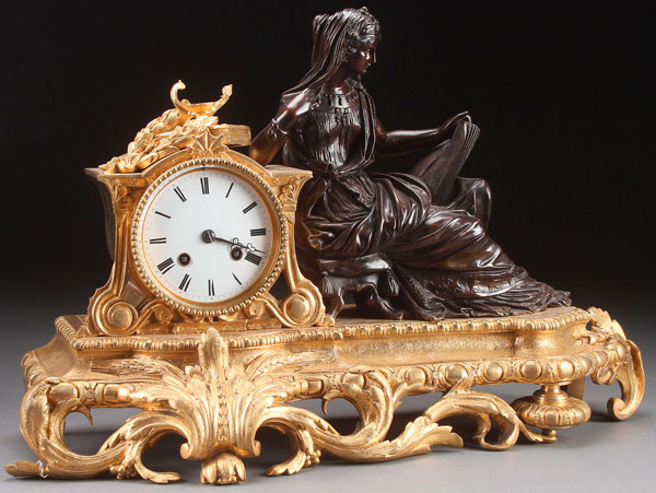A NAPOLEON III PATINATED AND GILT BRONZE FIGURAL MANTLE CLOCK. In the form of a neo-classic woman reading a book. Length 20 inches (51 cm).