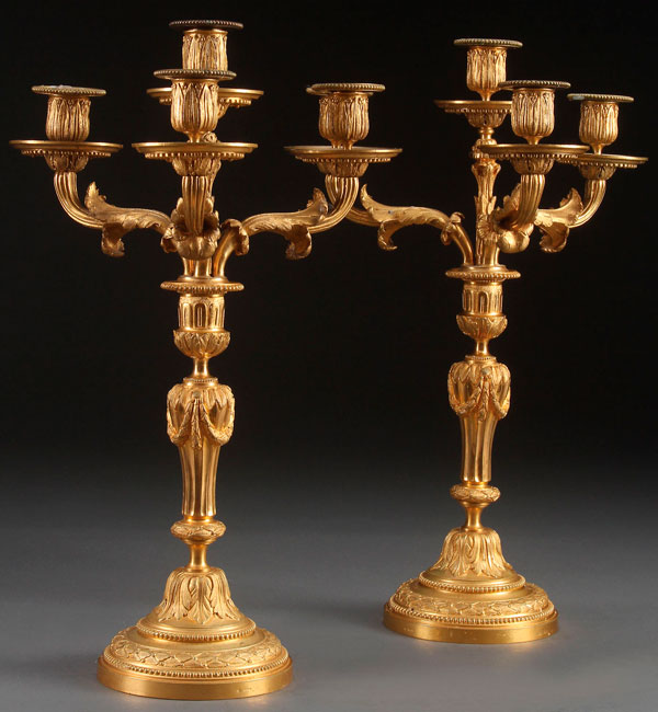 A VERY FINE PAIR OF LOUIS XVI STYLE GILT BRONZE CANDELABRA, 19TH CENTURY. Finely cast and chased. Stamped with maker's mark "L. Auzolle". Height 17.75 inches (45 cm).
