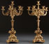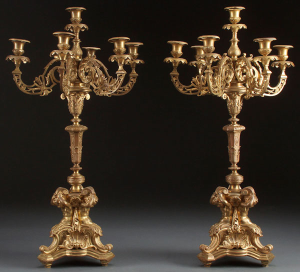 A PAIR OF NAPOLEON III GILT BRONZE CANDELABRA. With five scrolled candle arms raised on a three footed base with figural cherubs. Height 26 inches (66 cm).