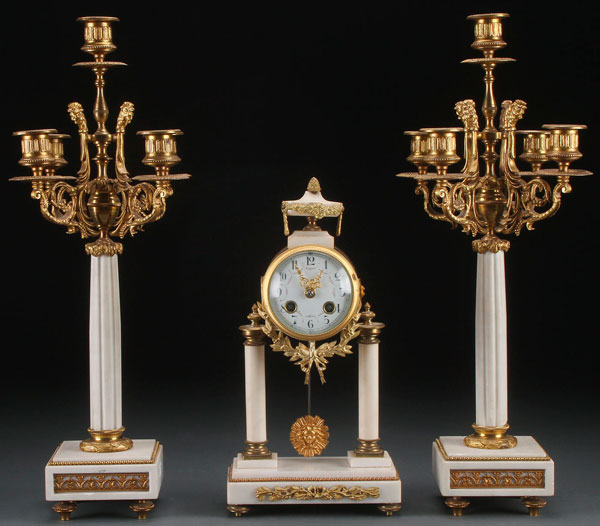 A LOUIS XVI STYLE GILT BRONZE AND MARBLE CLOCK GARNITURE, 19TH CENTURY. Comprising a circular clock raised on marble columns and surmounted with an urn form finial, with an associated pair of four arm candelabras with rooster head terminals. Largest height 19.75 inches (50 cm).