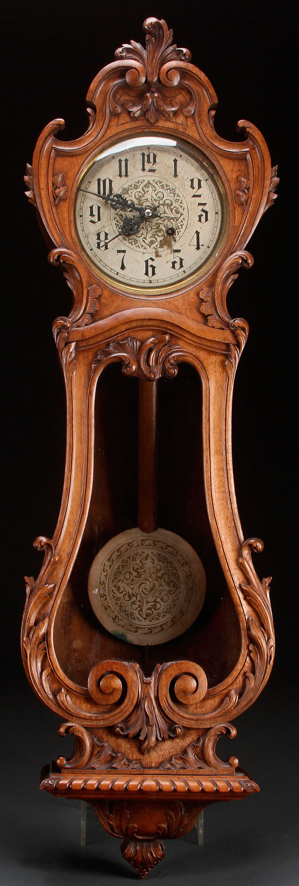 A VIENNA STYLE CARVED WALNUT WALL REGULATOR, LATE 19TH CENTURY. With carved acanthus scrolled decoration. Height 42 inches (106.5 cm).