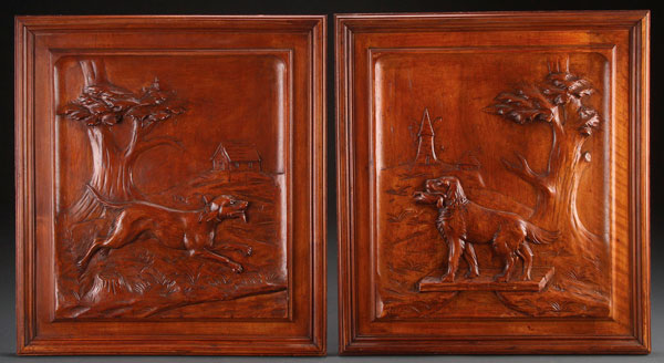 A PAIR OF CONTINENTAL RELIEF CARVED WALNUT WALL PLAQUES, CIRCA 1900. Each carved in heavy relief with hunting dogs in a scenic setting. 22 inches x 20 inches (56 x 51 cm).